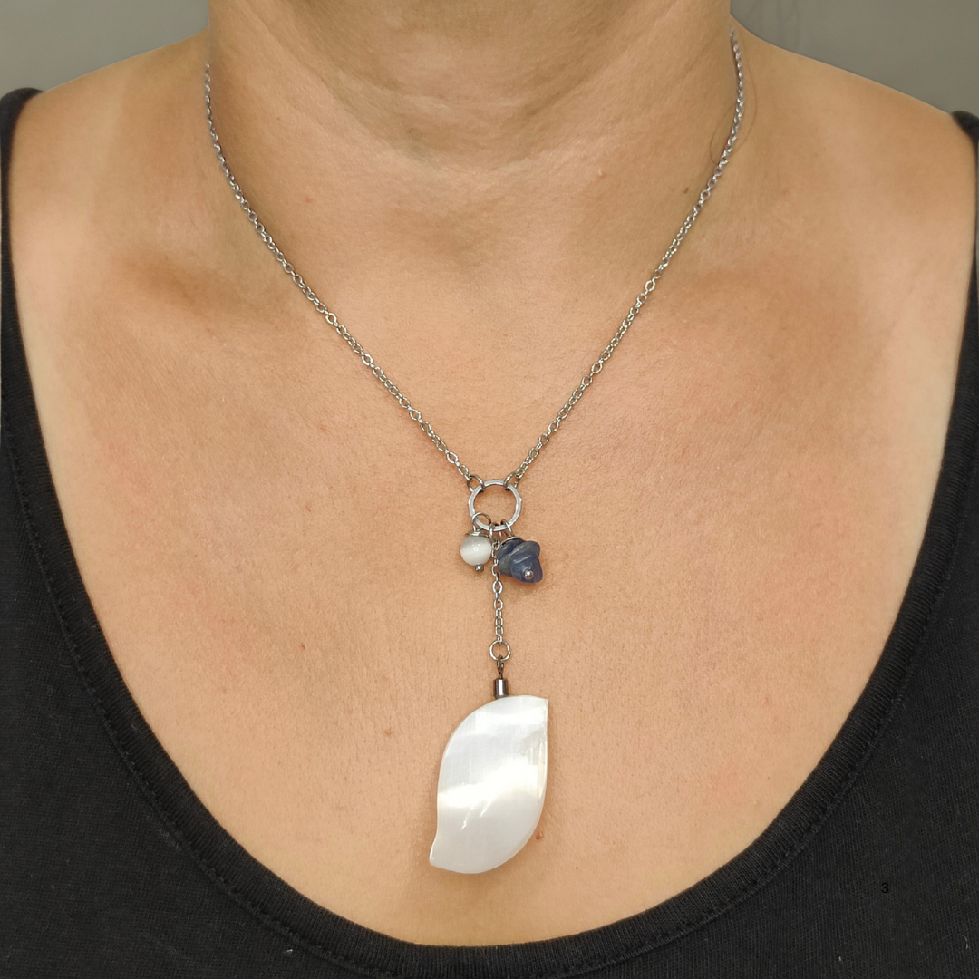 Collaret amb penjoll de Selenita en forma de fulla, penjoll bola Selenita 6mm i penjoll xips de Kyanita.