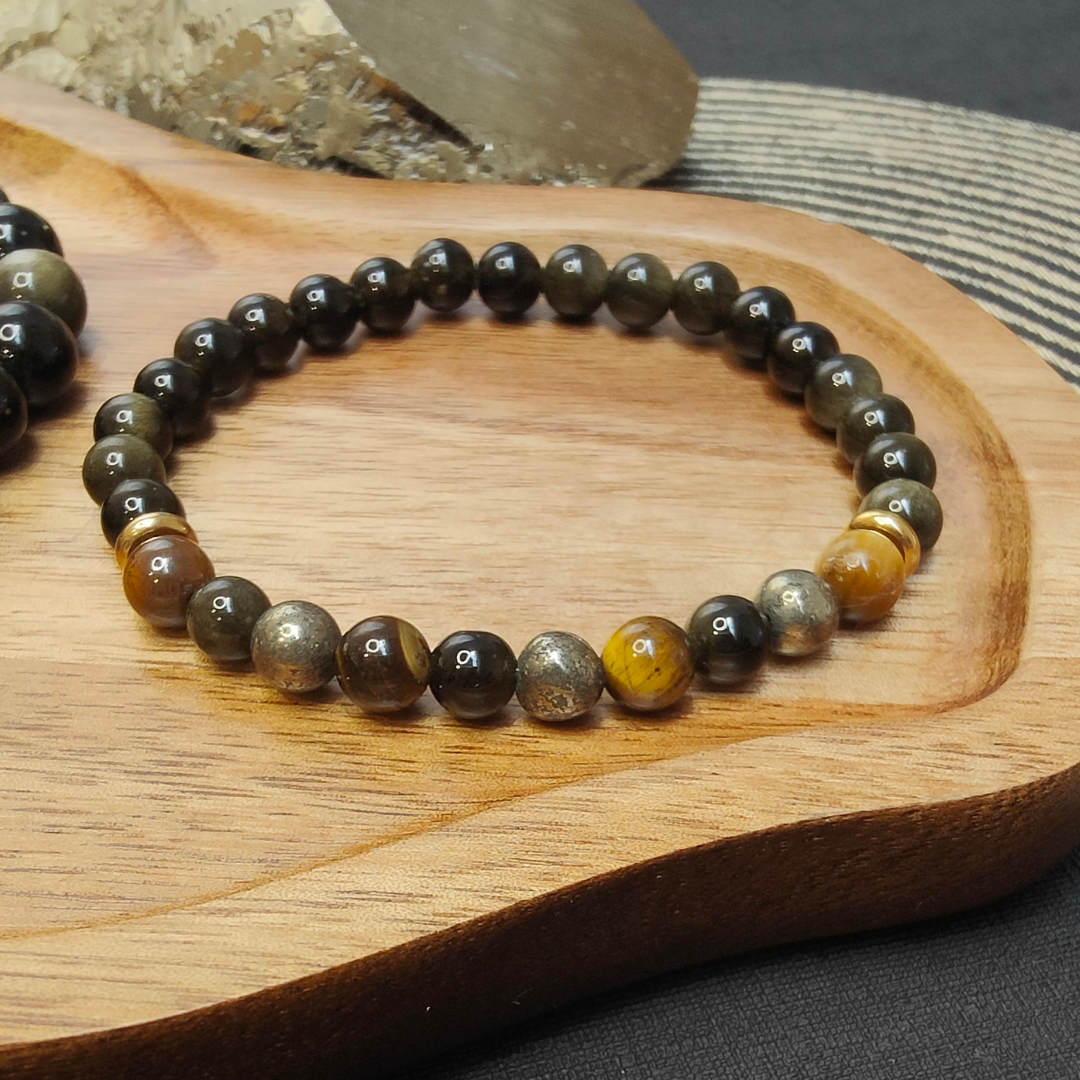 Polsera elàstica amb boles de 8mm o 6mm de Pirita, Obsidiana daurada i Ull de Tigre, detalls en acer inox daurat.