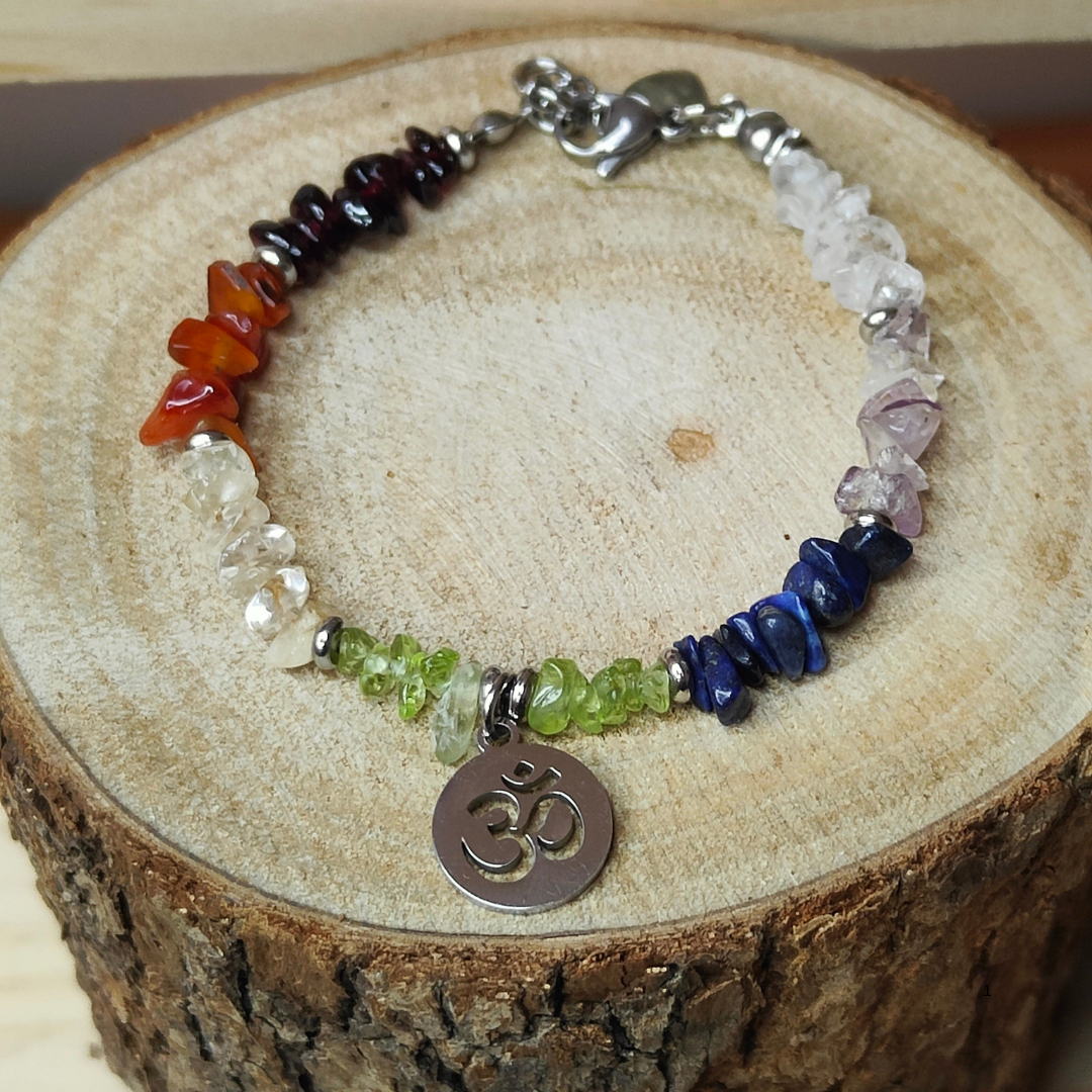 Polsera dels 7 xakres amb xips: Granate, Carneola, Citrí, Olivina, Lapislàtzuli, Ametista i Quars blanc - medalla amb símbol OM en acer inox.