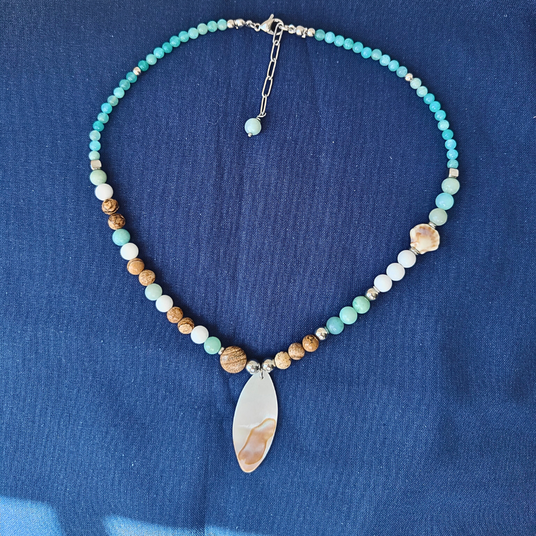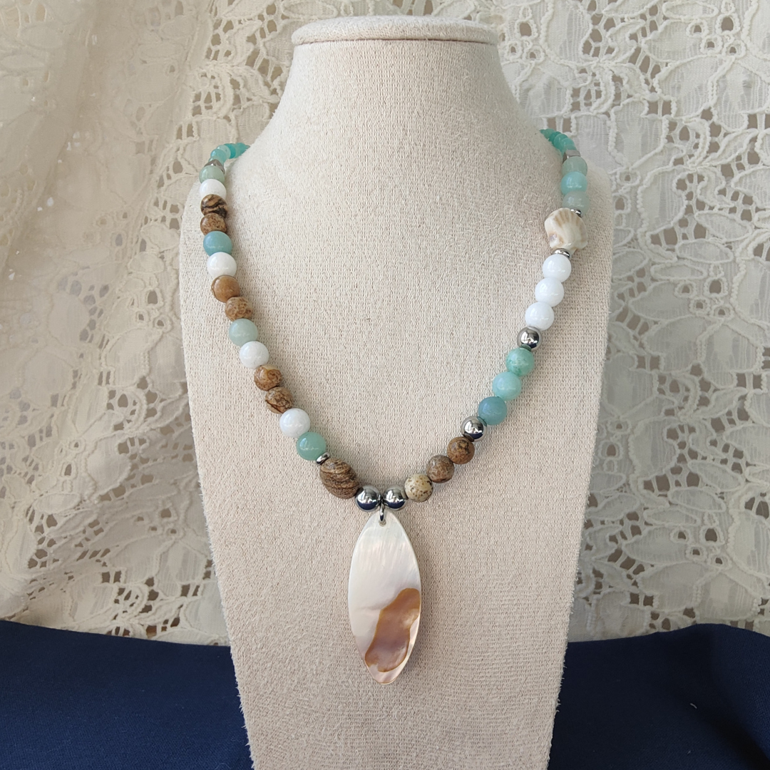 Este collar de piedras naturales integra la fuerza terrosa del jaspe paisina, la serenidad de la amazonita, la pureza del mármol blanco y el brillo del nácar, creando una joya simbólica que inspira equilibrio, bienestar interior y armonía diaria.