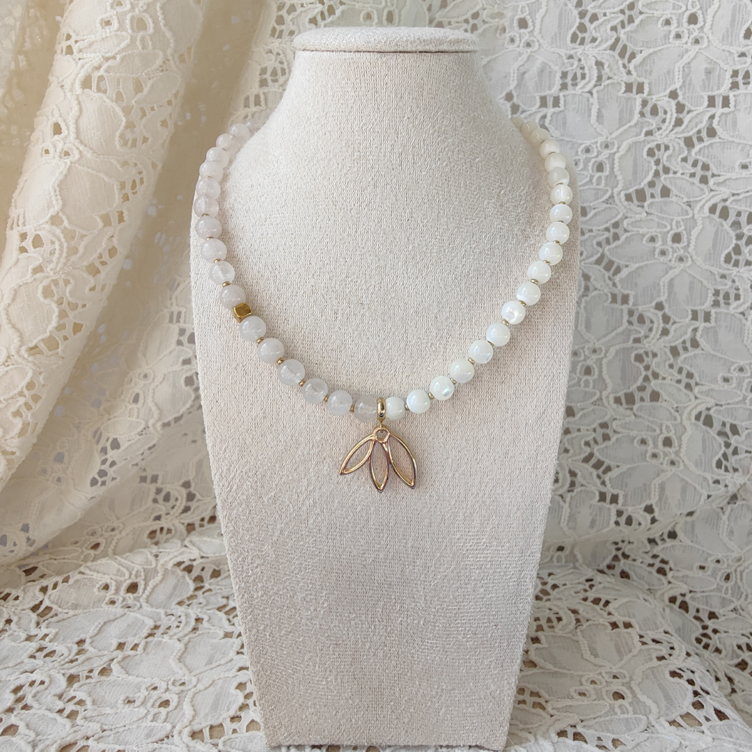 Collar delicado y lleno de simbolismo, creado con cuarzo rosa y nácar, rematado con un elegante colgante en forma de flor de loto. Una pieza pensada para acompañar procesos emocionales, aportar calma interior y reforzar la autoestima.
