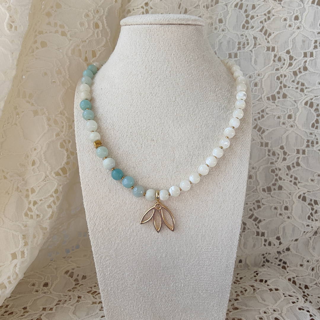 El collaret d’Amazonita i Mareperla amb penjoll de flor de lotus és un amulet de calma profunda i renaixement interior. Cada pedra ha estat escollida per acompanyar processos de canvi, sanar emocions antigues i obrir espai a una energia més lleugera i amorosa.
