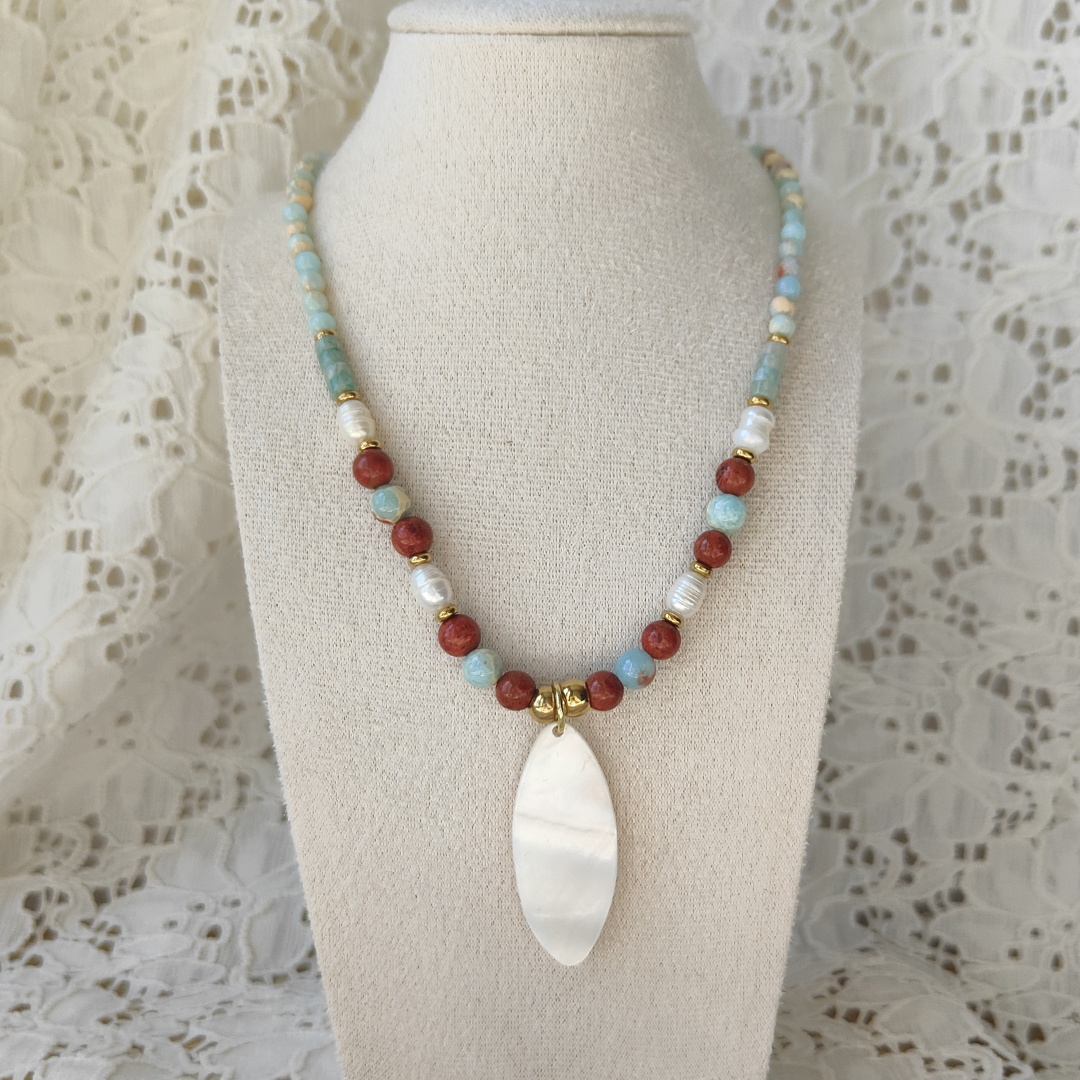 El nàcar, amb el seu reflex irisat, es vincula amb la protecció i la pau interior. La forma de llàgrima aporta un toc romàntic i sofisticat, reforçant la sensació de suavitat i equilibri energètic de tot el collaret.