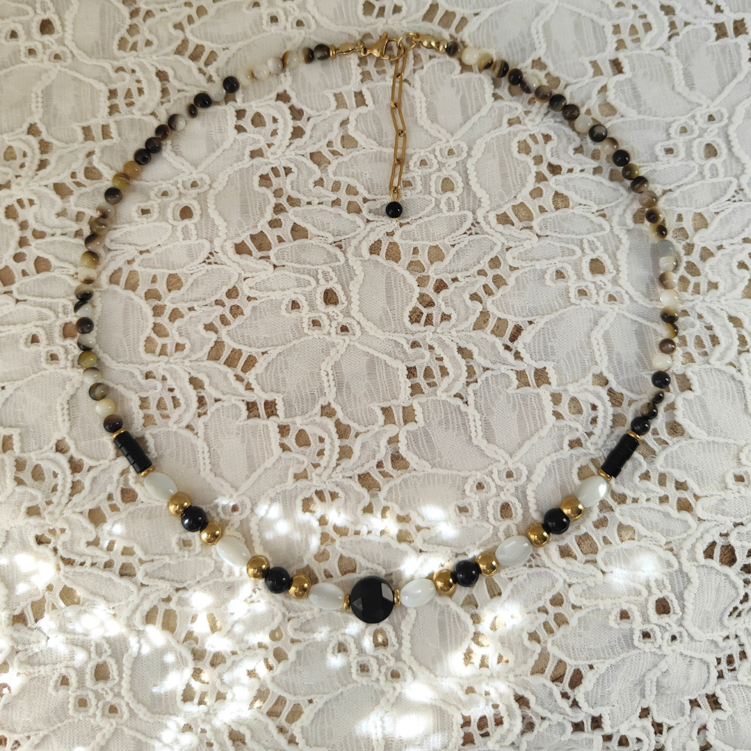La combinació de la foscor profunda de l’obsidiana amb la lluentor perlada del nàcar crea un contrast intens i ple de significat. El collaret Mare Perla Llengua Negra es converteix en un amulet contemporani que acompanya processos de sanació, empoderament i renaixement personal.